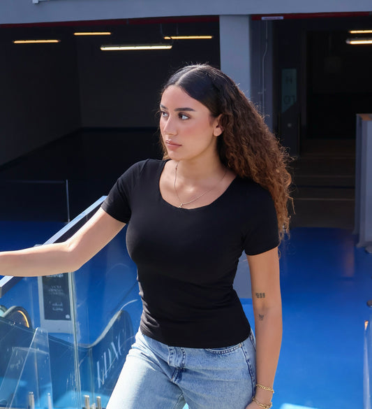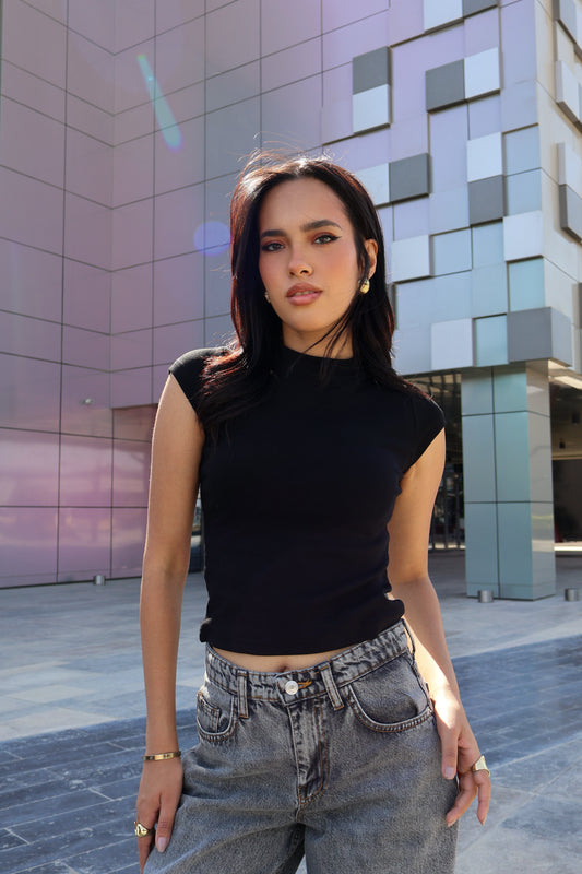 Sold outBLACK RIBBED COTTON CAP-SLEEVED TOP