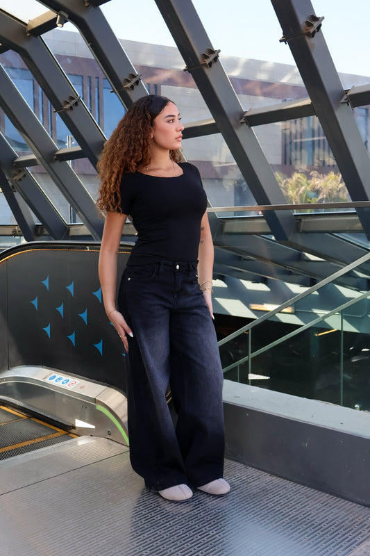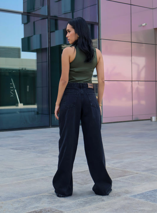 BLACK STONE-WASHED MID-RISE WIDE LEG