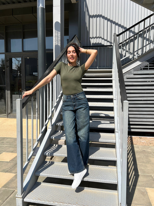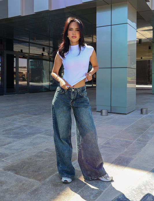 DARK BLUE MID RISE WIDE-LEG DENIM
