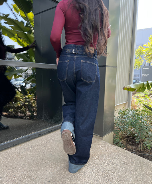 BLUE WIDE LEG DENIM WITH TURN UP HEMS