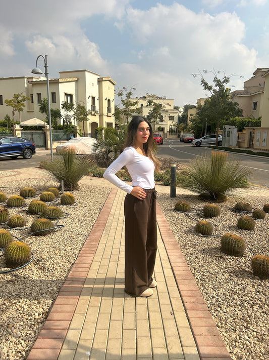 BROWN SQUARE NECK LONG-SLEEVE BASIC TOP